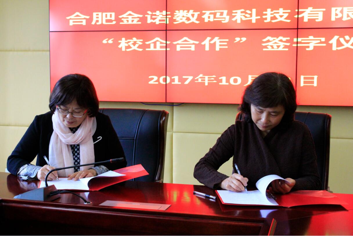 为公司未来发展储备人才和选拔人才,公司积极响应国家关于加强企业和学院合作的号召,2017年10月13日下午,公司与安徽职业技术学院共建“金诺”班签字仪式在安徽职业技术学院学院行政楼十楼会议室举行。公司董事长田地、副总经理戴平与安徽职业技术学院副校长史锋共同出席了签约仪式,安职院艺术设计学院吕慧副院长主持签约仪式。